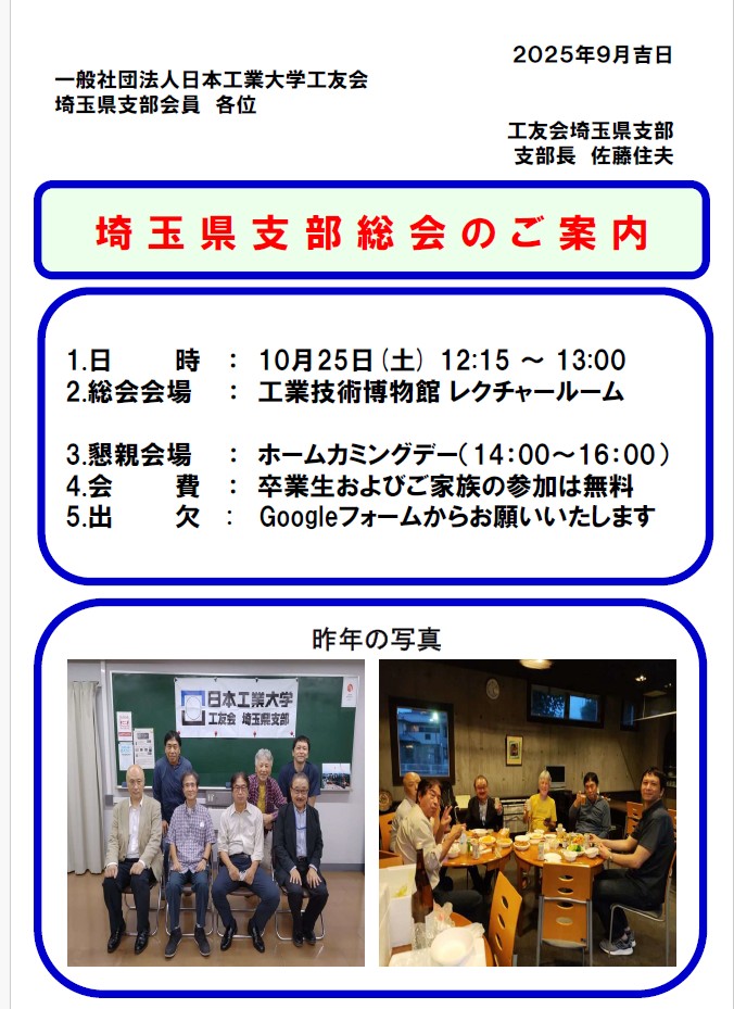 ・第22回埼玉県支部総会 2026年10月または11月 場所:工業技術博物館 レクチャールーム